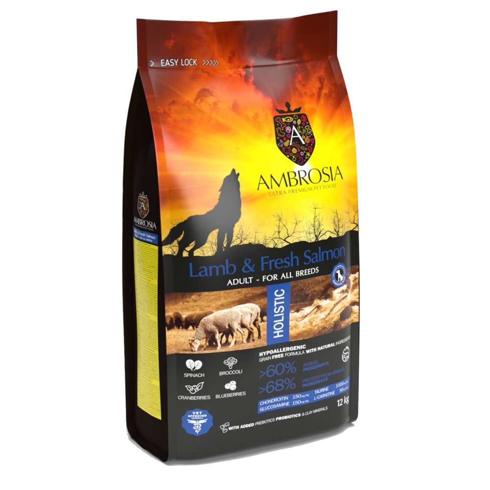 אמברוסיה מזון לכלב בוגר כבש וסלמון 12 ק"ג + 5 חטיפים מתנה