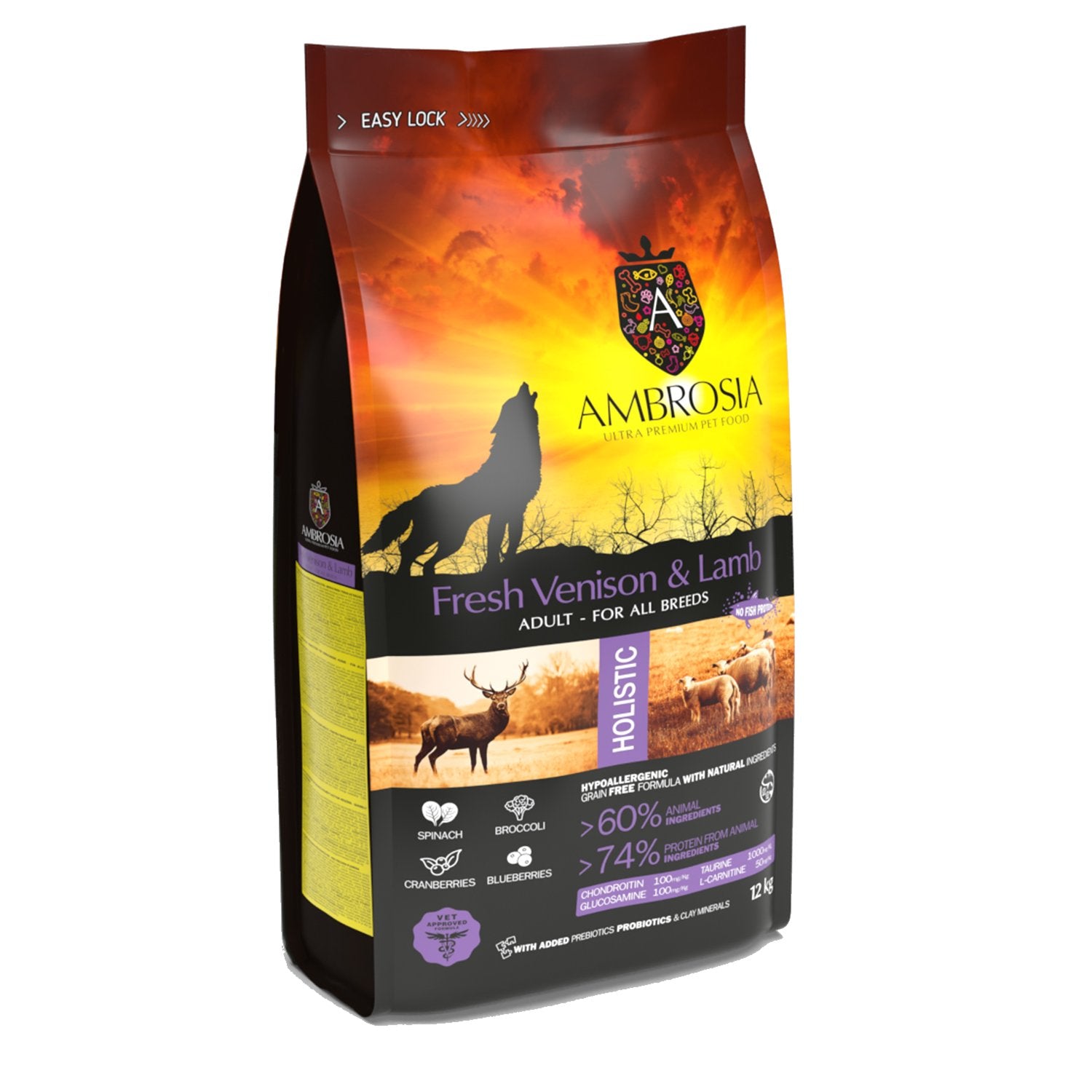 אמברוסיה מזון לכלב בוגר צבי וכבש 12 ק"ג + 5 חטיפים מתנה