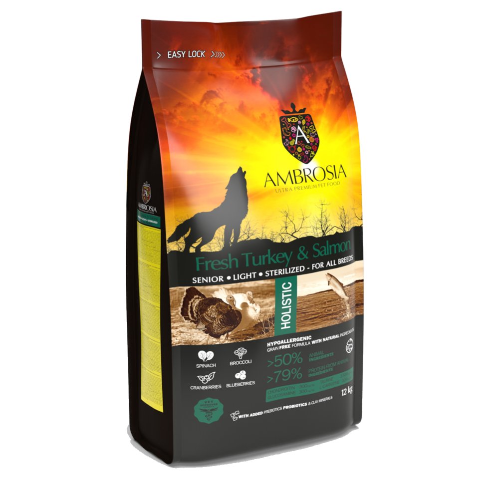 אמברוסיה לכלב סניור לייט הודו וסלמון 12 ק"ג + 5 חטיפים מתנה