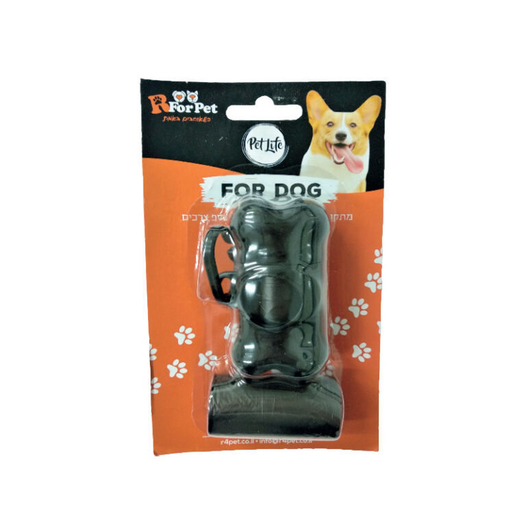 מתקן בצורת עצם עשוי פלסטיק איכותי, מגיע בצבע שחור אלגנטי וכולל גליל שקיות לאיסוף צרכים.