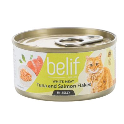 מעדן איכותי לחתולים בטעם טונה וסלמון מבית BELIF– מנה טעימה המתאימה כתוספת מזינה למזון יבש או כפינוק בפני עצמו.
