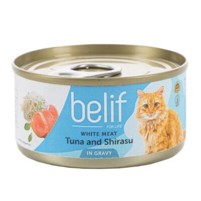 מעדן איכותי לחתולים בטעם טונה ושירסו מבית BELIF– מנה טעימה המתאימה כתוספת מזינה למזון יבש או כפינוק בפני עצמו.